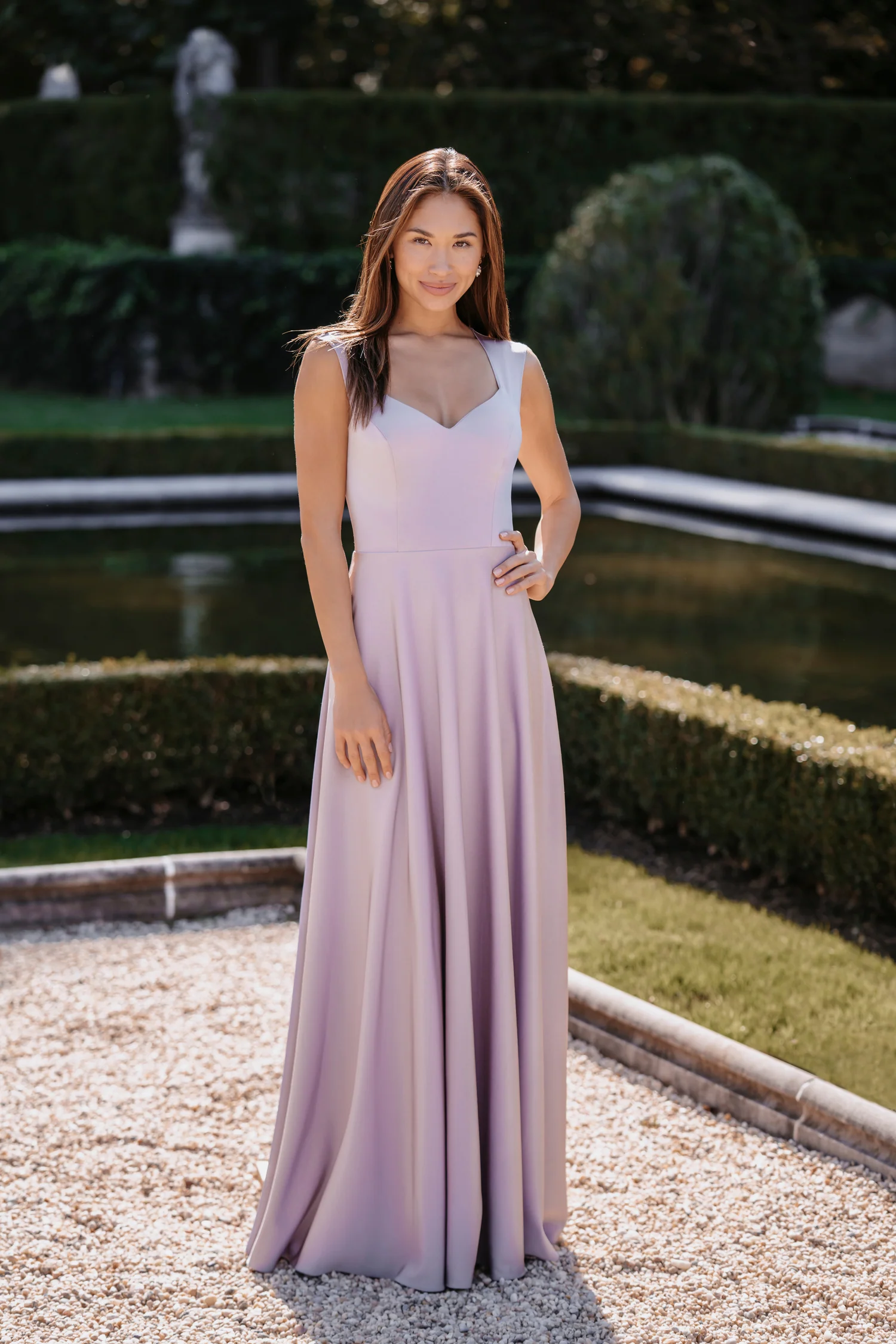 This stretch satin gown is accented by a modern keyhole back.