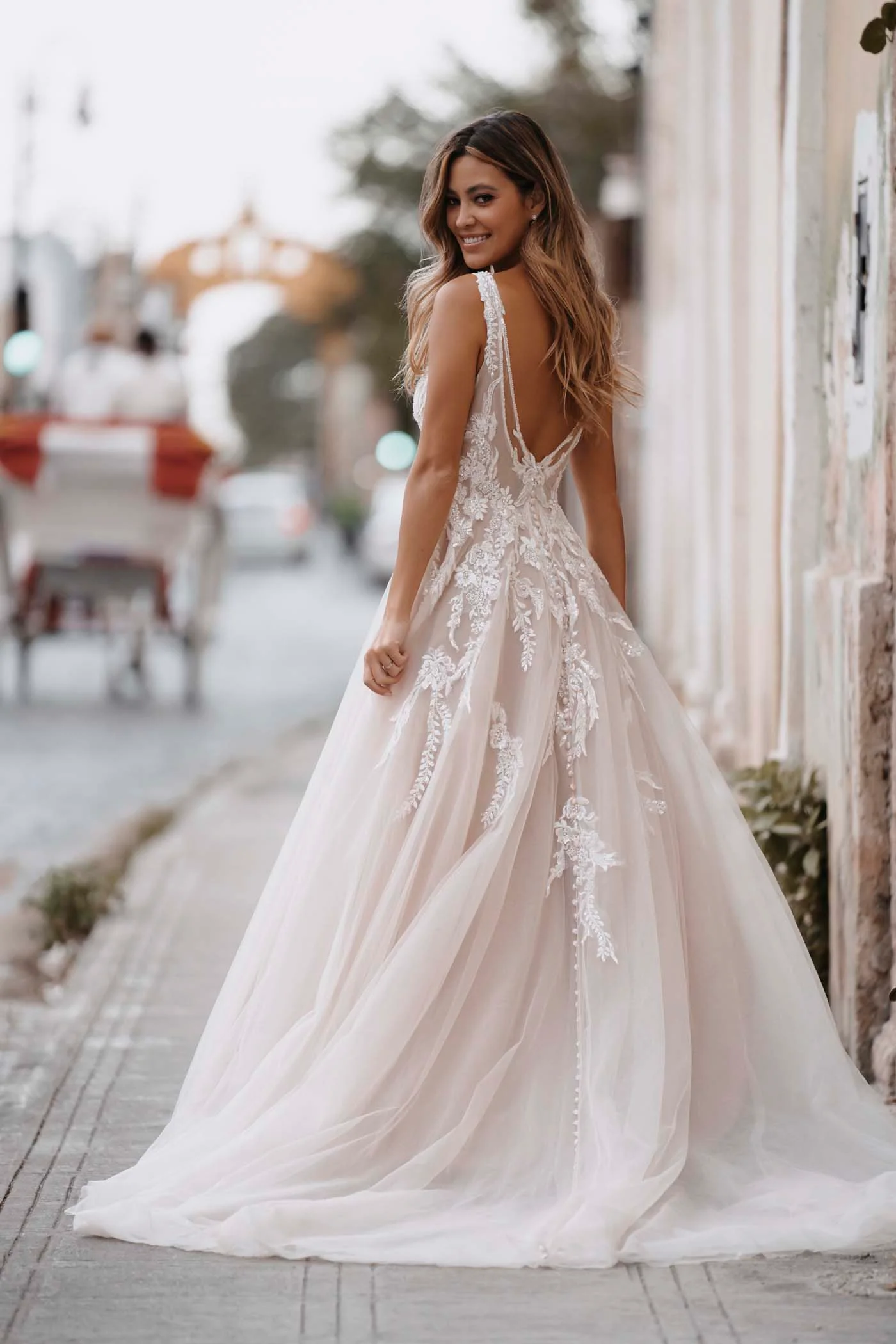 Luxurious, sparkling appliqués trail down the bodice of this A-line tulle gown.