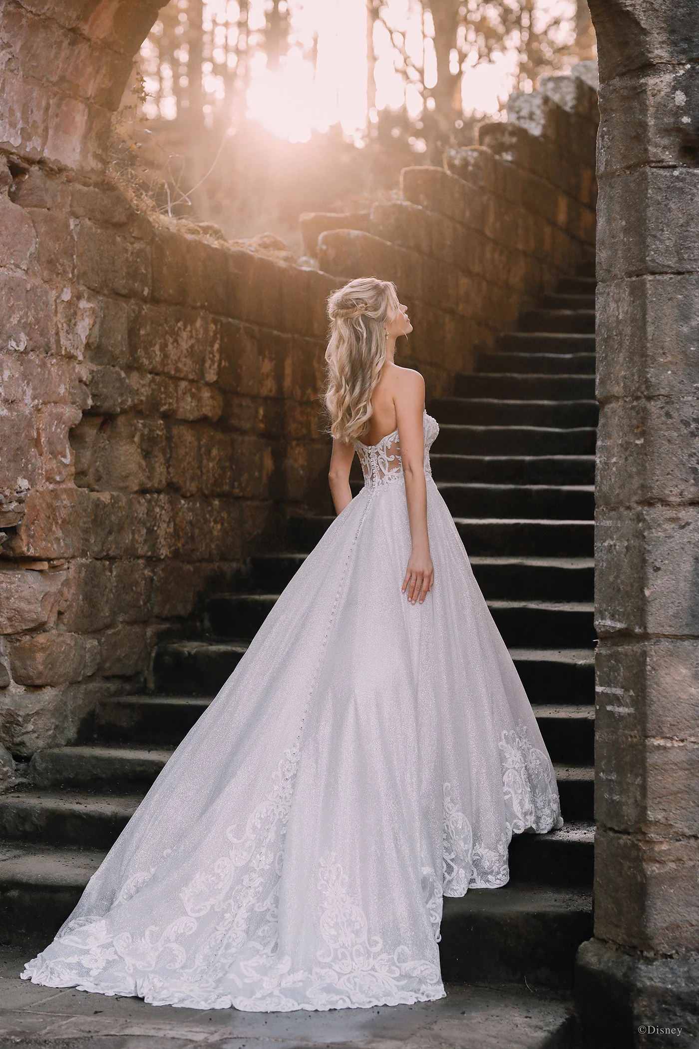 One enchanted evening, a fairy godmother transformed a gown into a work of art. This A-line gown features scrollwork inspired by the intricate details of Cinderella's magic carriage, while sparkling diamond tulle twinkles in the light. This Disney Fairy Tale Weddings D293 gown is also available with jacket D293J sold separately. Shop both gown and jacket when you search for your local Disney Fairy Tale Weddings retailer today.