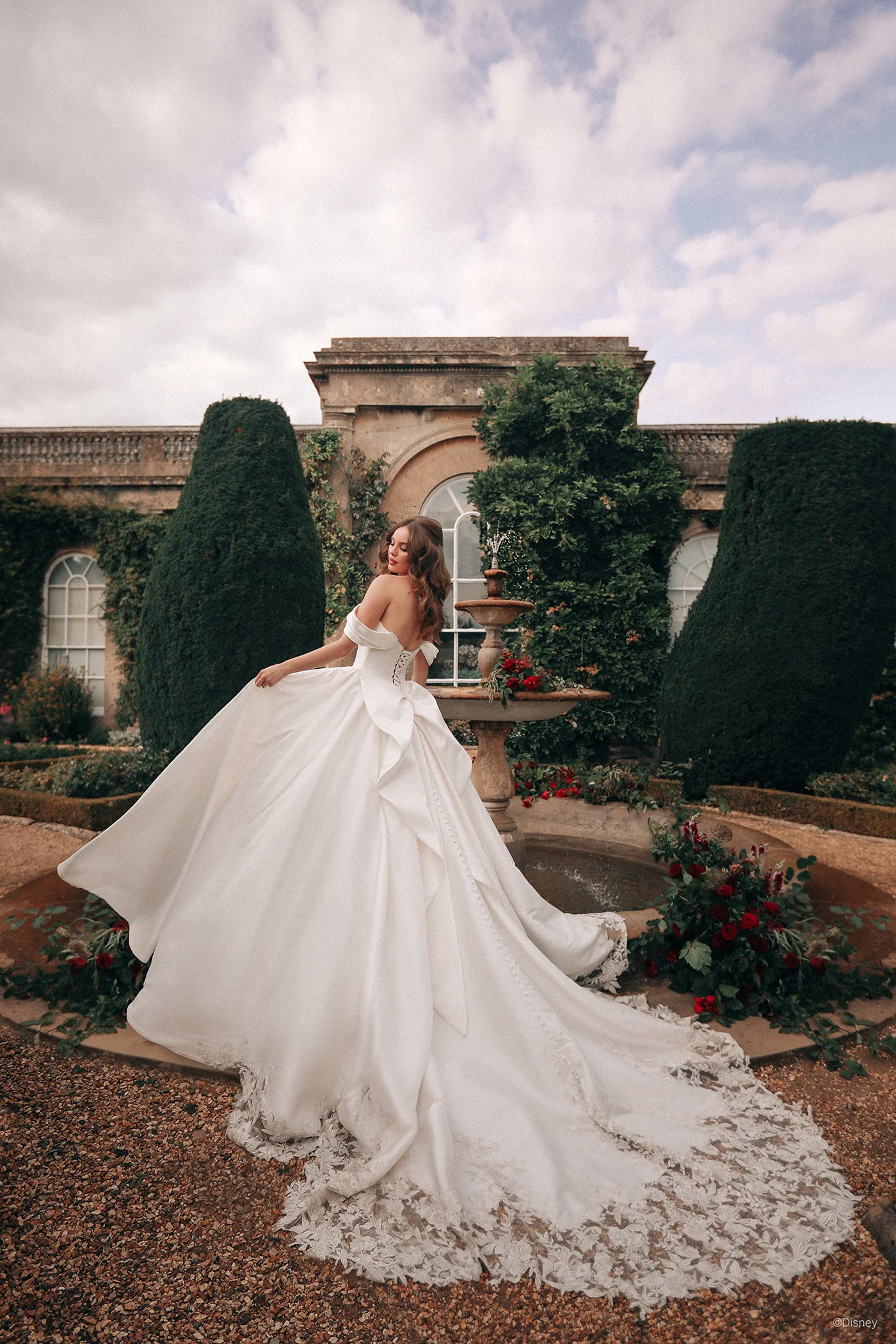 Embrace the adventurous and inquisitive spirit of Belle with our D362 Belle dress from Allure Bridals. Deceptively minimalist at first glance, the off-shoulder Belle-inspired Mikado ballgown is utterly captivating; an incredible illusion train is paired with a structured bow at the waist and corset closure bodice.