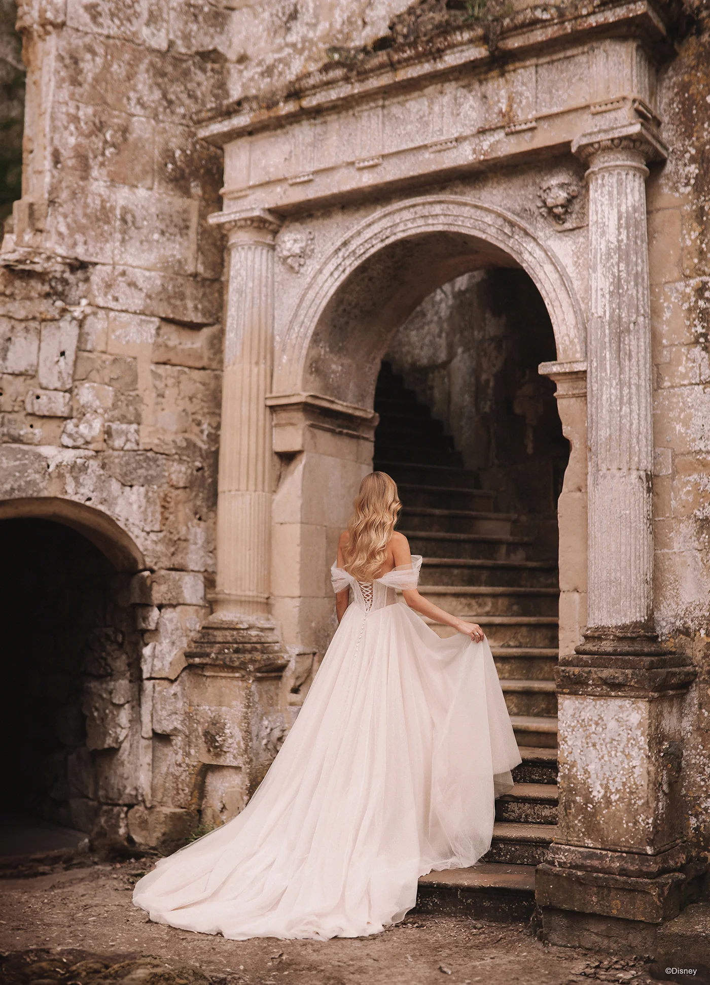 Cloudlike and ethereal, this Aurora-inspired off-shoulder gown is pulled straight from an enchanted dream. Pairing "Sleeping Beauty's" medieval woodland aesthetic with modern cottagecore femininity.