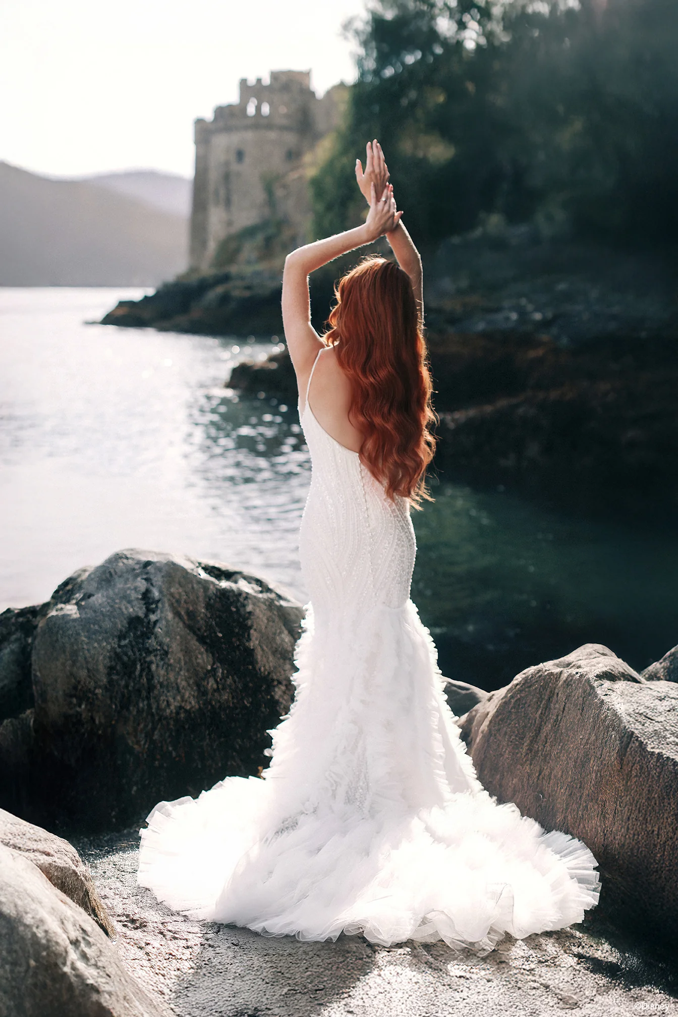 Inspired by Arielās journey beyond the sea, this mermaid-fit gown shimmers with the spirit of adventure and transformation. The bodice glistens with intricate beading and pearls, reminiscent of sunlight dancing across the oceanās surface, while the ruffled tulle skirt flows like gentle waves meeting the shore. A tribute to Arielās courage and curiosity, this gown captures the moment she follows her heart toward a world waiting to be discovered.