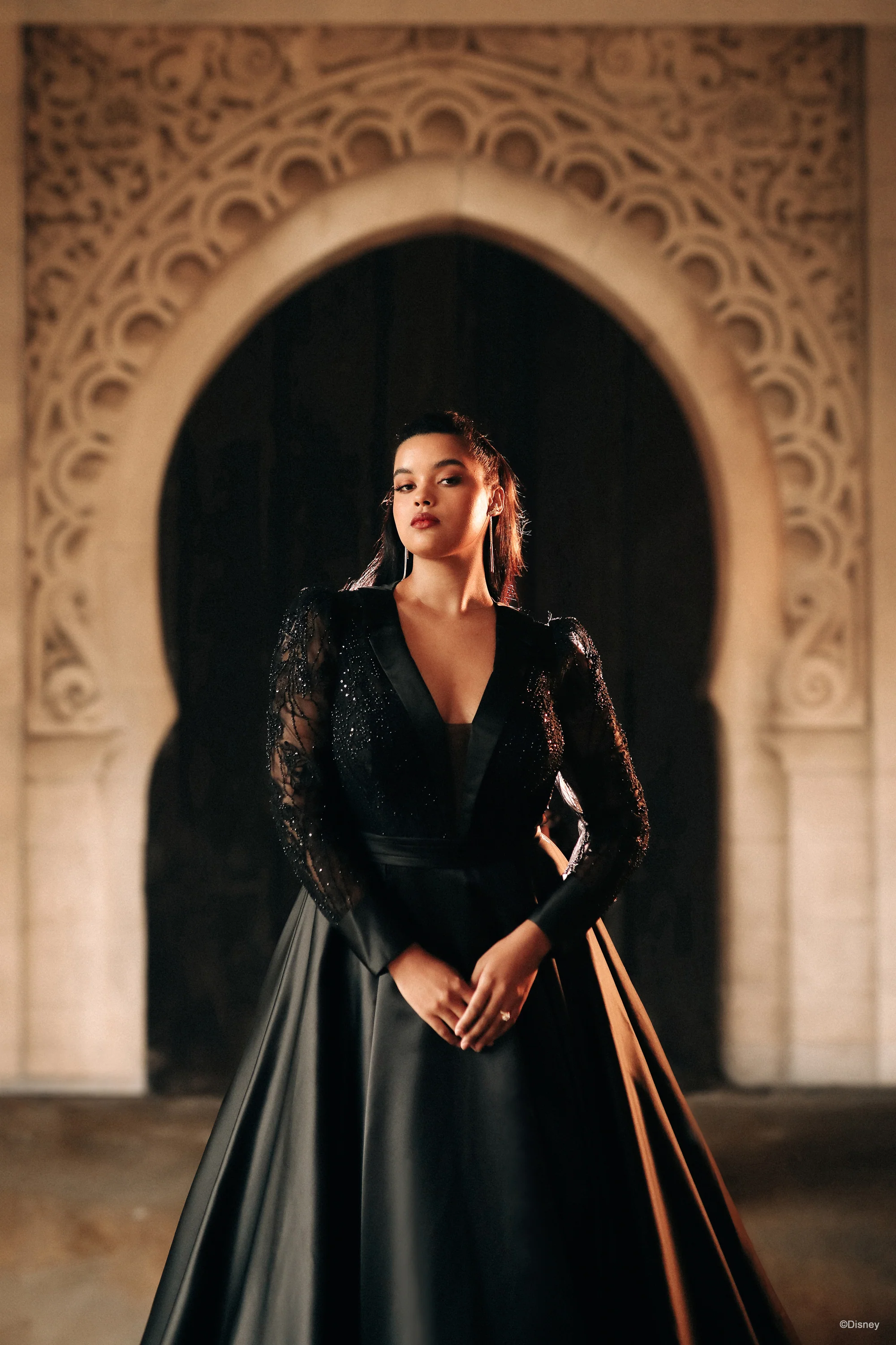 The Jafar-inspired gown echoes the iconic villain's notable collar with a plunging neckline and satin collar of its own. Perfectly tailored with a nod to menswear, the bodice is paired with a lightly puffed full length sleeve and buttoned cuff.